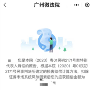 依据广州中院《关于特别代表人诉讼原告应获赔偿金额查询方式的公告》,投资者可以通过微信小程序搜索“广州微法院”,进入广州微法院点选页面下方“微诉讼”栏目,选择“代表人诉讼入口”,进入代表人诉讼通过平台查询是否属于适格的原告以及具体赔偿金额。