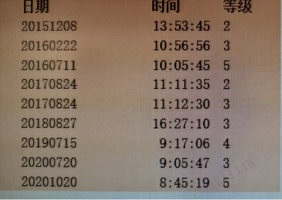 王希整理发现,自己按照正常周期(即一年1次)的平均风险等级应该是2~3级,而自己在2016年7月11日、2019年7月15日和2020年10月20日这三次风评未到期的时候所作的风险评测等级则有所异常。根据王希提供的风险测评表,记者发现,在非正常时间节点上王希所作出的风险等级结果均明显高于3等级。