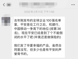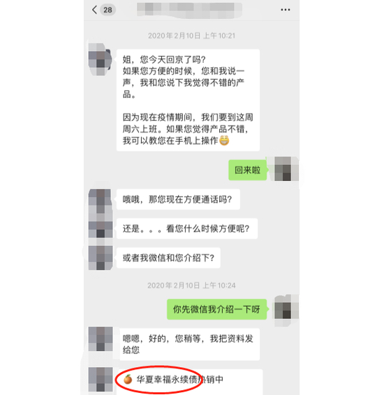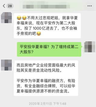 据王希回忆,客户经理杜女士在一开始介绍陕国投·九通基业这一产品时就告诉她,九通基业是华夏幸福的全资子公司。据王希提供的聊天记录截图显示,杜女士称,平安集团与华夏幸福签订了一个战略合作协议,平安现在是华夏幸福的第二大股东,最近也发了不少华夏幸福的产品。平安作为华夏幸福的融资方,有险资,有全金融综合牌照,可以给华夏幸福提供源源不断的资金流。