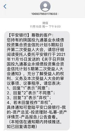 王希表示,因为平时工作较忙,且出于对平安银行的信任,起初并没有注意到陕国投·九通基业的分红逾期情况。直到2021年11月15日,她收到了平安银行发来的“关于召开陕国投·九通基业永续债投资集合资金信托计划5期第二次受益人大会通知”的短信,在询问客户经理杜女士后,她才得知,产品兑付出现了困难,最近几个季度的利息也没有到账,自己这是“踩雷”了。