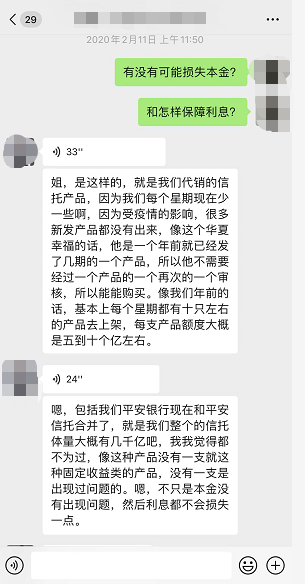 此外,杜女士还称,信托类的产品因为应监管要求,肯定要在合同里写着有一定投资风险的。她表示,平安银行跟平安信托合并后信托体量大概有几千亿,这种固定收益类的产品没有一支出现过问题,不止是本金,甚至利息都不会损失一点。