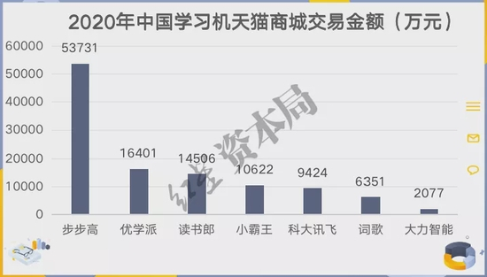 根据前瞻经济学人整理自天猫商城的数据,2020年步步高凭借核心教育资源优势和长期品牌影响力,在学习机交易额、市场份额上遥遥领先;科大讯飞目前只能算第二梯队选手。