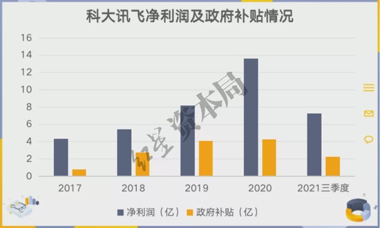 公司财报显示,2017年~2020年以及2021年前三季度,科大讯飞净利润分别为4.35亿元、5.42亿元、8.19亿元、13.64亿元、7.29亿;而获得的政府补助分别为0.77亿元、2.76亿元、4.12亿元、4.26亿元、2.25亿;政府补助占净利润比例分别为17.8%、50.9%、50.3%、31.2%、30.9%。
