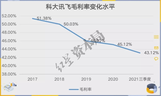 2017年~2020年以及2021年前三季度,科大讯飞毛利率分别为51.38%、50.03%、46.02%、45.12%、43.12%。