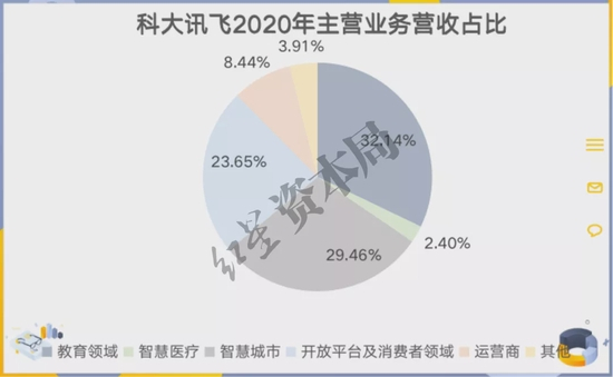 根据2020年企业年报显示,2020年教育领域收入占总营收比为32.14%;智慧城市业务占总营收比为29.46%;开放平台及消费者领域业务占总营收比为23.65%,这三项业务合计占总营收比超85%。