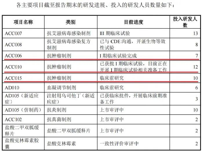 3.928亿元的“创新药研发及研发技术中心大楼购买项目”中剔除0.37亿元的“研发技术中心大楼购置项目”之后,剩下的6项研发管线中有4项属于抗肿瘤项目,分别“ACC006 BCC II 期临床项目”、“ACC006 肺鳞癌化疗联用 II 期临床项目”、“ACC006 PD-1 联用 II 期临床项目”和“ACC010 I/II 期临床项目”,合计募资约为2.095亿元。