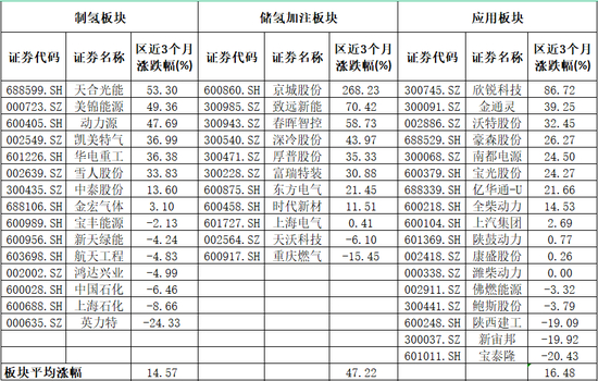 根据下图,近3个月中游储氢加注板块平均涨幅在47.2%左右,而上下游的平均涨幅分别为14.57%和16.48%,表现明显较弱;而在上游制氢环节上,拥有光伏产业优势后布局制氢的公司,在二级市场表现较好。