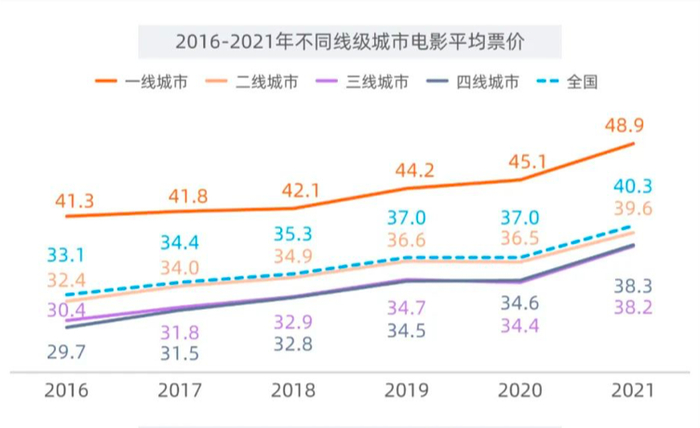 根据灯塔研究院和灯塔专业版联合发布的《2021中国电影市场年度报告》,近5年来,电影平均票价累计上涨了7.2元,其中四线城市涨幅明显,2021年平均票价达38.3元,近5年来累计上涨8.5元。受疫情影响,年平均上座率也从2016年的14%下跌至8%,各线级城市的平均上座率趋同,一线城市平均上座率下跌最多,高达10%。