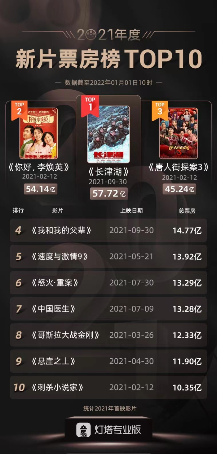 2021年爆款国产影片频出。主旋律大片《长津湖》打破了影史票房纪录,取得57.72亿元票房,登顶冠军;票房黑马《你好,李焕英》取得54.14亿元票房,位列年度第二;《唐人街探案3》取得45.24亿元票房,位列年度第三。
