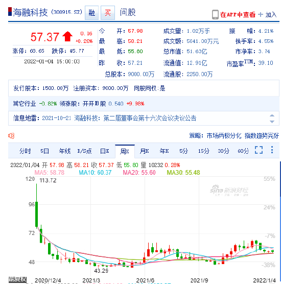 二级市场上,受制于食品饮料板块表现一般,整个2021年海融科技股价涨幅并不明显,去年股价上涨7.83%。截止1月4日收盘,公司最新股价报57.37元,目前市值51.63亿元。