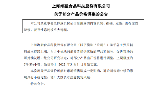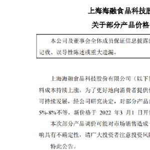1月4日晚间,被誉为 “奶油第一股”的海融科技发布公告,鉴于各主要原辅料成本持续上涨,为了更好地向消费者提供优质的产品和服务,促进市场的可持续发展,经公司研究决定,对部分产品出厂价格进行调整,上调幅度为5%到8%不等,新价格于3月1日开始实施。海融科技表示,本次部分产品调价可能对市场销售造成一定影响,对公司未来业绩的影响具有不确定性。