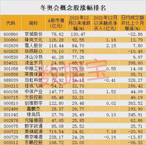 资金层面上,自去年12月以来,部分冬奥会概念股获得北上资金和融资客青睐。数据宝统计,按照成交均价粗略计算,燕京啤酒、河钢股份、洲明科技等3股获北上资金增持超亿元。美锦能源、雪人股份、中体产业、锋尚文化、中国重汽等5股获融资客净买入超亿元。