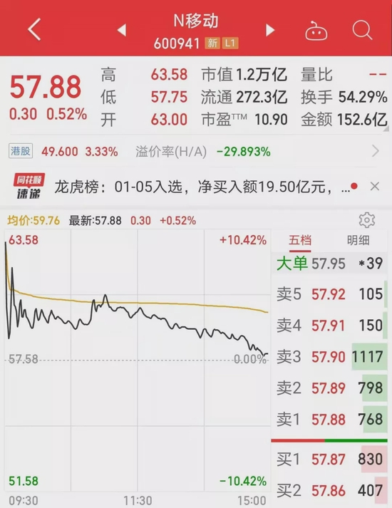 中国移动此次回归A股,IPO募资金额接近560亿元,一举打破了去年8月由中国电信创下的A股近十年募资纪录。上市首日刚开盘,中国移动股价高开9.41%至63元/股,早盘开盘不久股价迅速下挫,收盘涨幅收窄至0.52%,当天内盘达到142万手,外盘113万手,相差29万手。