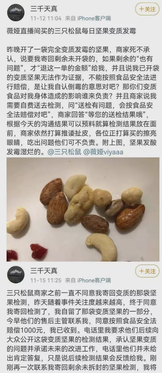 网友“三千天真”投诉,“薇娅直播间买的三只松鼠每日坚果变质发霉”。11月6日,网友“咪嘞个咻”在微博投诉三只松鼠的“牛肉粒”大面积发霉长毛;11月13日,网友“菲比喵呜悦”在微博投诉天猫超市买的三只松鼠手撕面包“居然发霉”,照片显示深灰色块状霉斑清晰可见。