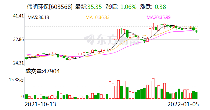 市场表现来看,过去一年来,伟明环保股价持续攀升,累计涨幅接近90%,不过2021年12月中旬以来出现小幅回调。截至1月5日收盘,公司股价下跌约1%,报收于35.35元/股。