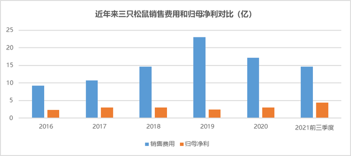 很显然三只松鼠当下是想极力摆脱营销费用的“包袱”影响。2021年的前几年,营销费用大幅增长虽然扩大了营收规模,但并没有转化为利润,净利润一直在3亿元左右徘徊。