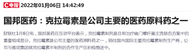 国邦医药今日午后在互动平台表示,克拉霉素制剂是目前治疗幽门螺杆菌主流联合方案中的重要组成部分。克拉霉素是公司主要的医药原料药之一,公司与雅培集团就克拉霉素半制剂的合作生产在积极推进中。