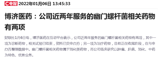 博济医药今日在互动平台表示,公司近两年服务的幽门螺杆菌相关药物有两项,其中一项为诊断药物,相关试验已结束,资料已交申办方;另一项为治疗药物,目前正在收尾阶段,在与申办方整理数据中。幽门螺杆菌相关药物属于消化类药物,而公司临床研究以肿瘤、肝病、消化、中药为特色、优势业务。