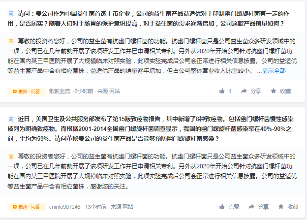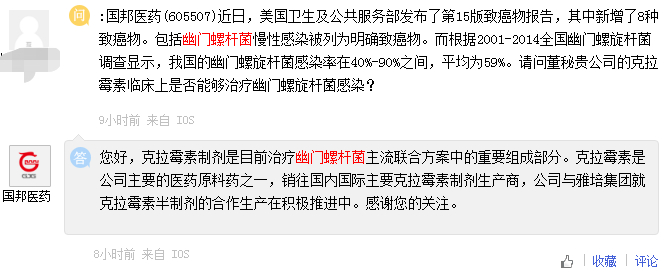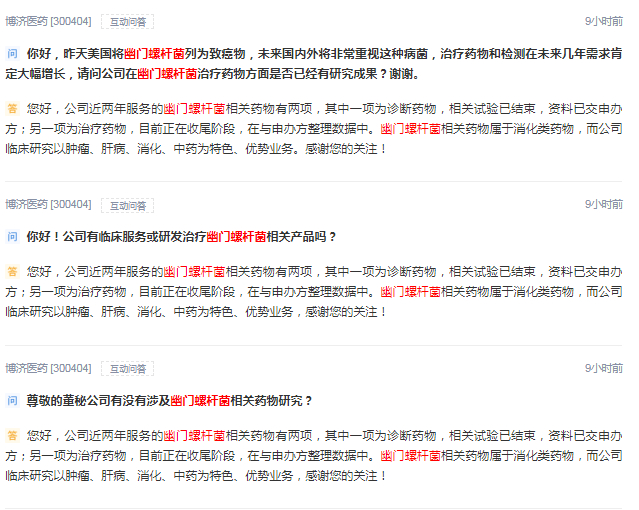 此外,界面新闻获悉,在互动平台上,尔康制药(300267.SZ)、博济医药、睿智医药、谱尼测试、迈克生物(300463.SZ)等公司回复投资者关于“幽门螺杆菌”的相关问题。