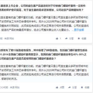 该公司于1月6日称,经公司自查,关注到近期关于公司涉及到幽门螺杆菌领域的相关讨论;目前公司主营业务仍为乳酸菌饮品,公司涉及到幽门螺杆菌领域的咀嚼片、饮品等产品尚处于产品投入阶段。截至公司2021年前三季度,上述产品收入占比小于公司营业收入的5%(该数据未经审计),对公司经营业绩影响很小。