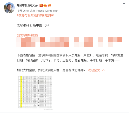 微博中,艾芬质疑爱尔眼科,“如此大的金额,如此众多的人群,是否构成行贿罪?”