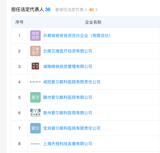 但红星资本局发现,宿迁爱尔眼科医院有限公司的法定代表人名为周铭,与爱尔眼科医院的关系十分紧密。公开介绍中,他是邯郸爱尔执行董事和总经理,此外,他还担任着咸阳、赣州、泉州等地的爱尔眼科医院有限公司法定代表人与高管。