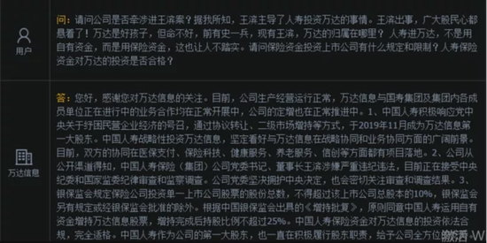 值得一提的是,今日,有投资者在互动平台向万达信息提问:请问公司是否牵涉进王滨案?据我所知,王滨主导了人寿投资万达的事情。王滨出事,广大股民心都悬着了!万达是好孩子,但命不好,前有史一兵,现有王滨,万达的归属在哪里? 人寿进万达,不是用自有资金,而是用保险资金,这也让人不踏实。请问保险资金投资上市公司有什么规定和限制?人寿保险资金对万达的投资是否合格?