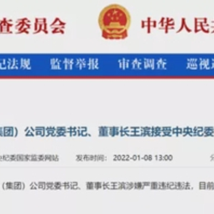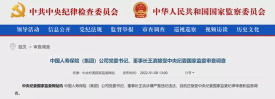 1月8日下午,中纪委网站通报,中国人寿保险(集团)公司党委书记、董事长王滨涉嫌严重违纪违法,目前正接受中央纪委国家监委纪律审查和监察调查。