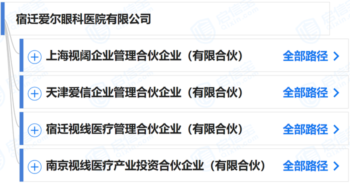 股东方面,宿迁爱尔眼科医院有限公司共有4名股东,分别为宿迁视线医疗管理合伙企业(有限合伙)、天津爱信企业管理合伙企业(有限合伙)(以下简称天津爱信)、南京视线医疗产业投资合伙企业(有限合伙)和上海视阔企业管理合伙企业(有限合伙)。