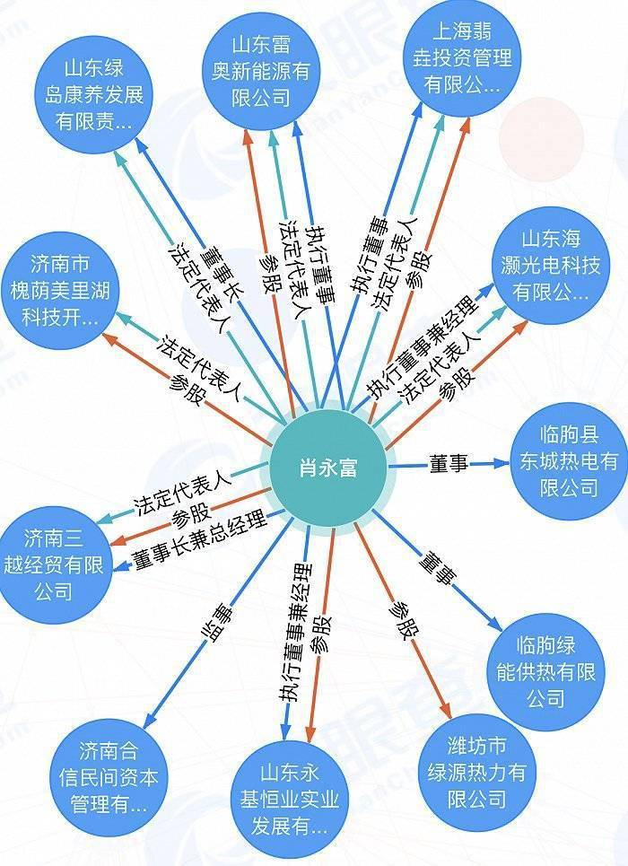 界面新闻查询天眼查获悉,肖永富实际控制了14家公司,其中在山东绿岛康养发展有限责任公司(简称“山东绿岛康养”)、山东雷奥新能源有限公司(简称“山东雷奥新能源”)、山东海灏光电科技有限公司(简称“山东海灏光电”)、济南三越经贸有限公司(简称“济南三越”)、济南市槐荫美里湖科技开发中心及上海翡垚投资的法定代表人或董事长等职务。
