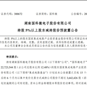 1月10日,国科微(300672,SZ)公告称,股东国家集成电路产业投资基金股份有限公司(简称“大基金”)计划在公告披露之日起15个交易日后的6个月内以集中竞价交易方式减持公司股份不超过364万股,即不超过公司总股本比例的2%。