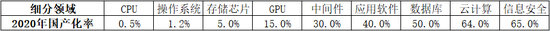 其次,软件中包含基础软件和云平台,包括OA、ERP、办公软件、政务应用、操作系统、数据库、PaaS等,操作系统的国产化比率仅1.2%,长期被国外技术封锁,国产化的增量空间可观,潜力较大。