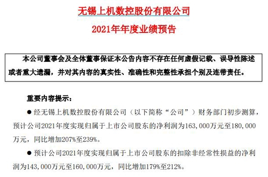 1月12日晚间,上机数控公告,预计公司2021年净利润为16.3亿元至18亿元,同比增加207%至239%。