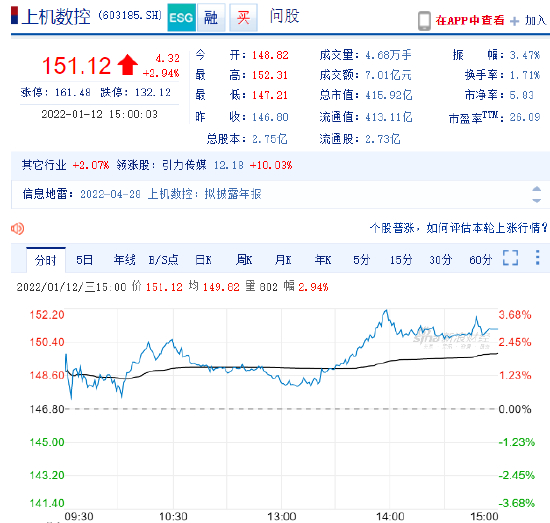 截至1月12日收盘,上机数控股价报收151.12元/股,涨2.94%,最新市值为415.92亿元。