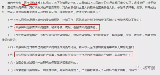 我们可以看到,《传染病防治法》一共9章,其中法律责任(第八章)里,与医疗机构相关的法律条款集中于第六十九条:
