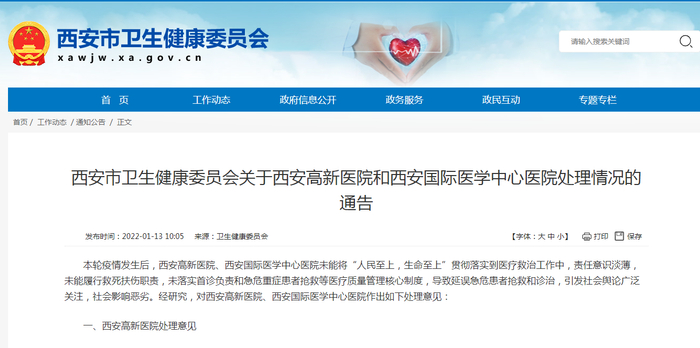 据西安卫生健康委员会网站1月13日消息,本轮疫情发生后,西安高新医院、西安国际医学中心医院未能将“人民至上,生命至上”贯彻落实到医疗救治工作中,责任意识淡薄,未能履行救死扶伤职责,未落实首诊负责和急危重症患者抢救等医疗质量管理核心制度,导致延误急危患者抢救和诊治,引发社会舆论广泛关注,社会影响恶劣。经研究,对西安高新医院、西安国际医学中心医院作出如下处理意见: