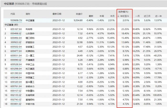 截至12日收盘,年初至今基建板块上涨2.01%。1月6日,基建工程指数大涨超4个点,7日、10日连续两个交易日继续拉升。近期两个交易日虽略有回调,但幅度不大。