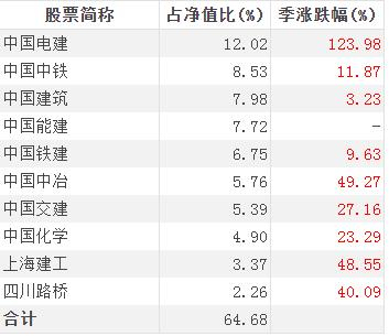 重仓持股看,三季报显示,截至9月末,基建50ETF前十大持仓资金占净值比例为64.68%,前十大持仓股票分别有中国电建、中国中铁、中国建筑、中国能建、中国铁建、中国中冶、中国交建、中国化学、上海建工四川路桥。除了中国能建三季度末才上市外,重仓的股票三季度都出现不同程度的涨幅。