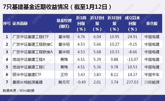根据Wind数据,截至1月12日,除了混合类基建基金“景顺长城能源基建”近一周收益为负以外,其余6只股票型基建基金近一周收益均超3%。