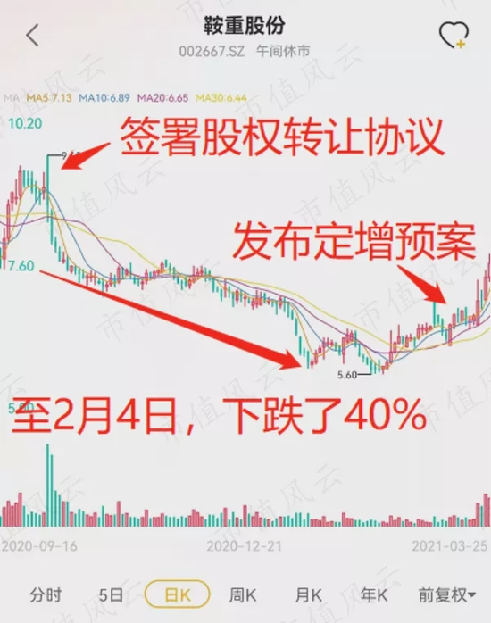 颇为巧合的是,自公司宣布控股股东变更后,股价就从2020年10月12日开盘价9.6元一路下挫至2021年2月4日的5.68元,跌幅达40.8%。
