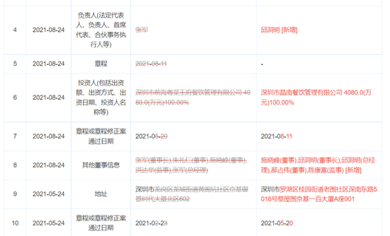 这笔交易很可能发生了反转。爱企查显示,深圳宝荷“京基御景荟都”商业项目的建设单位深圳市百纳投资有限公司,在去年4月变更了董高监,陈华陈家俊等退出,恒大系接任;而同年8月,恒大系高管又集体退出,重新换成了京基的人员。