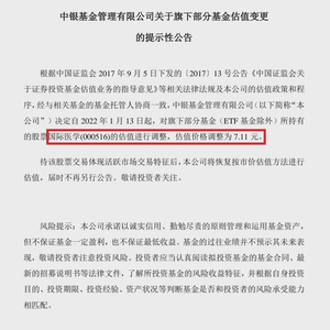 中银基金发布《旗下部分基金估值变更的提示性公告》,公告中表示,经与相关基金的基金托管人协商一致,中银基金决定自2022年1月13日起,对旗下部分基金(ETF 基金除外)所持有的股票国际医学(000516)的估值进行调整,估值价格调整为7.11 元。