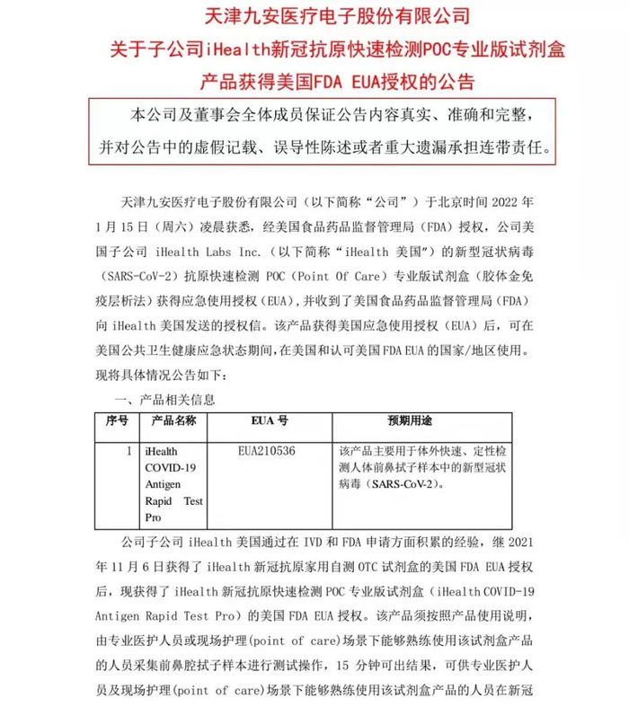 公司称,公司美国子公司 iHealth Labs Inc。的新型冠状病毒(SARS-CoV-2)抗原快速检测 POC(Point Of Care)专业版试剂盒(胶体金免疫层析法)获得应急使用授权(EUA),并收到了美国食品药品监督管理局(FDA)向iHealth美国发送的授权信。