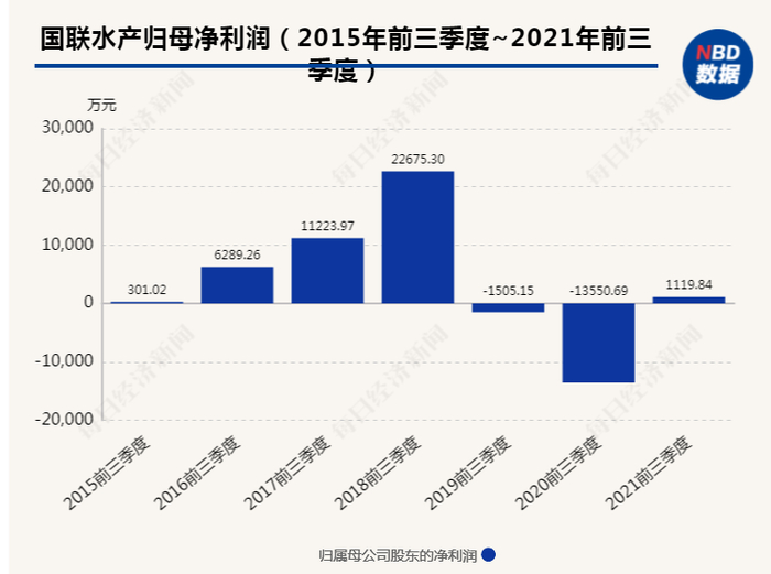也是从2019年开始,国联水产的业绩开始掉头向下,2018年还实现2.31亿元的盈利,但2019年净利润却亏损4.91亿元,2020年亏损2.69亿元,直到2021年前三季度才扭亏为盈,实现1119.84万元净利润。