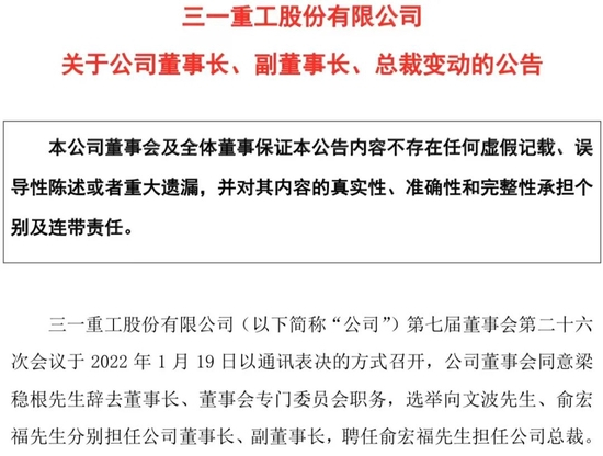 1月19日晚间,三一重工公告,梁稳根辞去董事长、董事会专门委员会职务,选举向文波、俞宏福分别担任公司董事长、副董事长,聘任俞宏福担任公司总裁。
