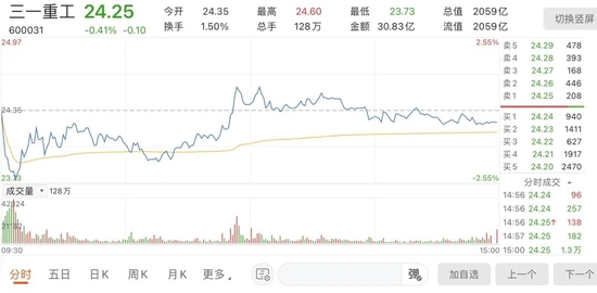 截至1月20日收盘,三一重工报24.25元/股,跌幅0.41%,总市值2059.45亿元。