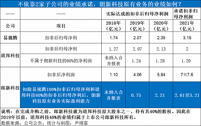 业绩承诺压顶,为完成考核要求,2家子公司在2018年至2021年4年间也是拼了。2021年3月31日朗新科技公告显示,截至2020年,易视腾擦边完成考核,邦道科技超额完成。二者2018-2020年累计扣非归母净利实现率分别约103%、140%。