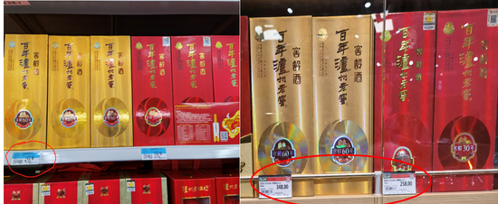 此外,记者注意到,中低端白酒在渠道间的价格差异巨大。以年末刚刚涨价的“百年泸州老窖窖龄”酒为例,在某商超中,60年458元、30年358元;而在一连锁超市中, 60年348元/瓶,30年258元/瓶,两个渠道同款三四百元价位白酒,价差竟达到110元/瓶。
