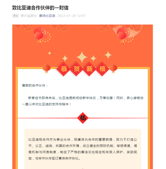 近日,“廉洁比亚迪”微信公众号在《至比亚迪合作伙伴的一封信》中表示,2021年,比亚迪查处不廉洁、严重违规员工94人;移交公安机关立案侦查7起22人,依法追究刑事责任。此外,因违反廉洁合作相关协议,28家供应商被比亚迪追究违约责任。