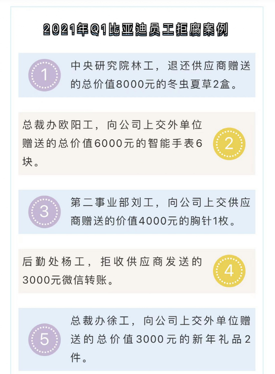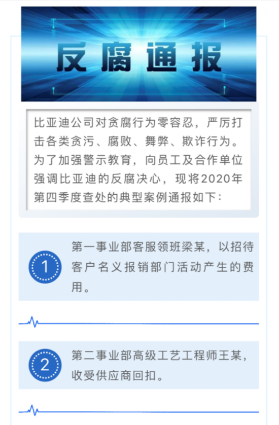 据了解,比亚迪曾多次对公司反腐案例进行通报。在去年三月公司通报案例中,共有10起员工贪腐行为,通报的人员涉及职务包括客服领班、工程师、综合科长、食堂主管、销售等,涉及行为包括违规报销、接受供应商回扣、违规收受节日费、违规参与活动套取积分等。